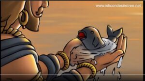 satyavrata was compassionate. He placed the fish in his kamandalu (water pot). But overnight, the fish grew too large for the pot. He shifted it to a pond, then to a river, and finally to the ocean — yet the fish kept growing until it filled the waters with its massive form.