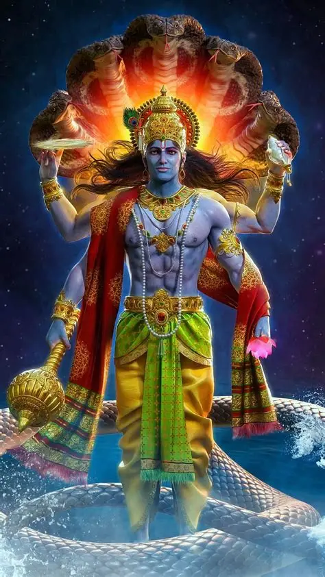 Lord Vishnu is the preserver of the universe, the protector of dharma, and the source of compassion, balance, and eternal harmony. He sustains creation with love, restores order whenever it falters, and manifests in divine forms to guide souls back to truth.